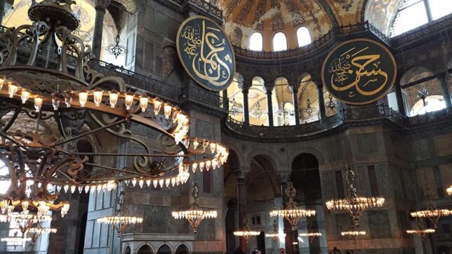 イスタンブールのシンボル、ブルーモスク(スリタンアフメト・モスク)の隣にアヤソフィア博物館がある。ビザンティン建築の最高傑作とされる建物で、天井が巨大なドームになっており、漆喰や大理石の壁がはがれた部分からキリストのモザイク画が覗いている。